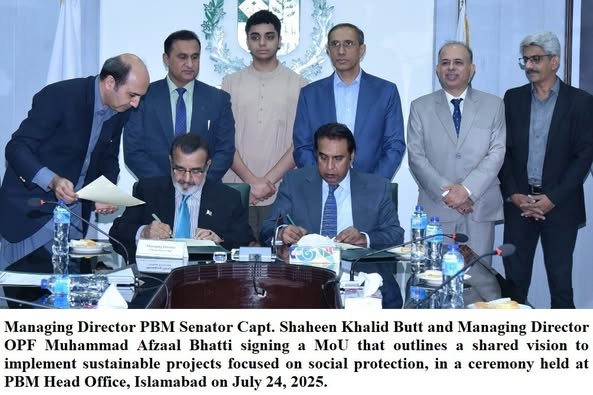 In a historic step in the field of social protection, Pakistan Bait-ul-Mal and Overseas Pakistanis Foundation have signed a Memorandum of Understanding. In a grand ceremony held at the Pakistan Bait-ul-Mal headquarters, MD Pakistan Bait-ul-Mal Senator Captain Shaheen Khalid Butt and MD Overseas Pakistanis Muhammad Afzal Bhatti signed the Memorandum of Understanding.