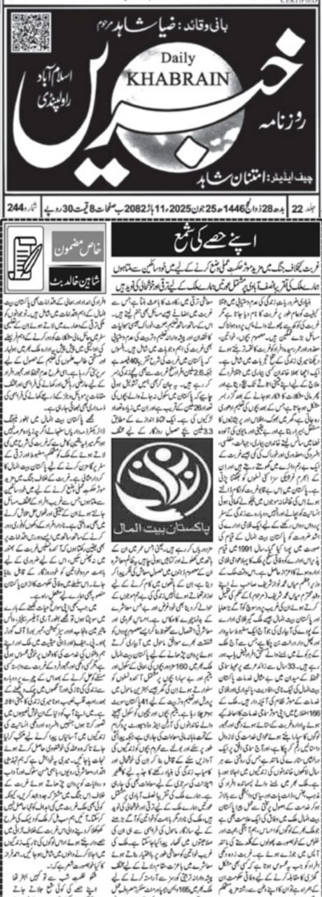 An articale "Apny Esy ke shama" by Managing Director Pakistan Bait-ul-Mal Senator Capt. Shaheen Khalid Butt