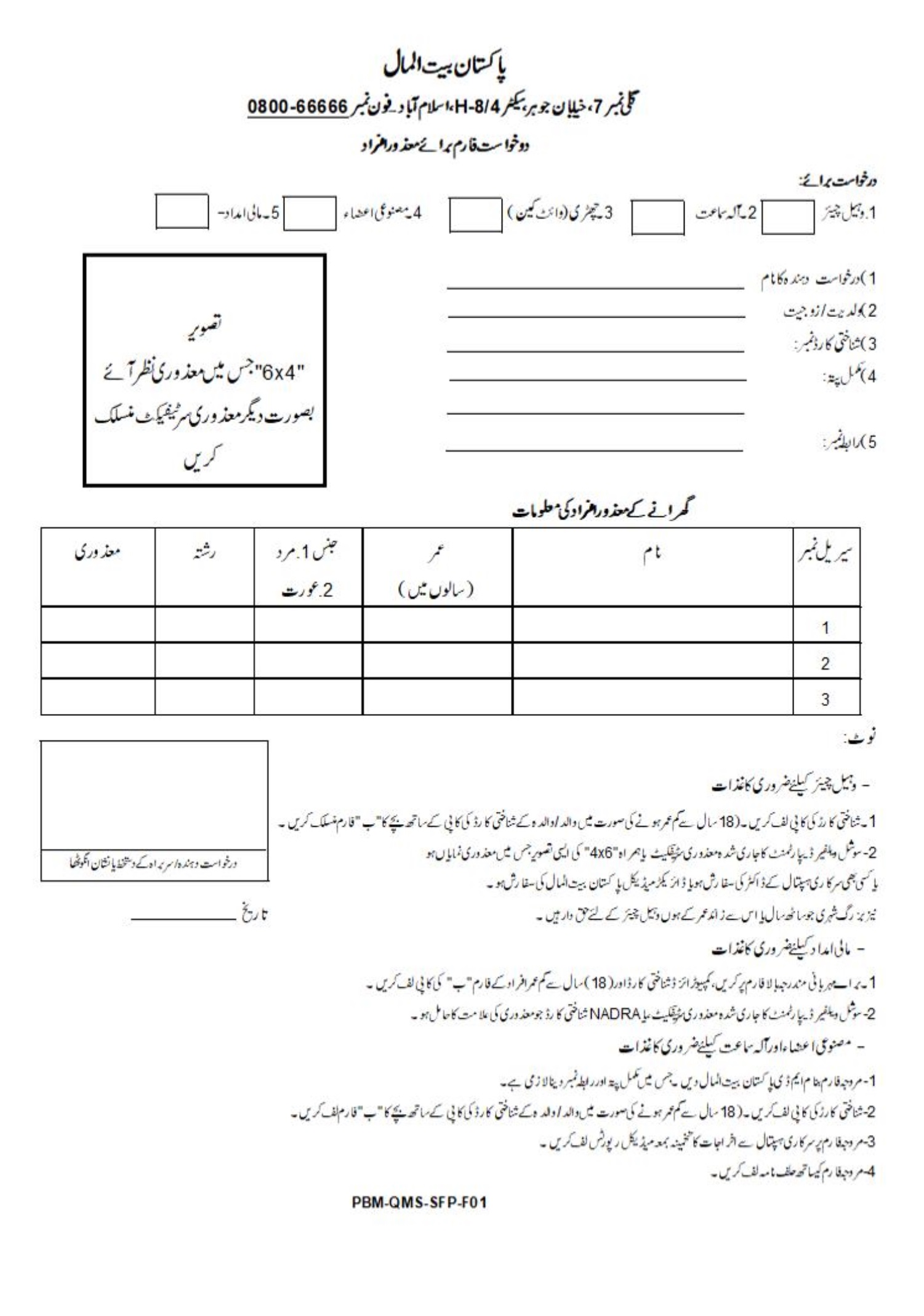 Pakistan Bait-ul-Mal (PBM) is committed to empowering Persons with Disabilities (PWDs) by providing financial assistance, standard/customized wheelchairs, hearing aids, white canes, and artificial limbs.